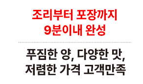 최상의 상태로 고객에게 전달될 수 있도록 조리부터 포장까지 9분 컷! 기본 후라이드. 다양한 양념소스, 숯불 치킨까지 고객 모두의 입맛을 만족시킵니다. | ||||